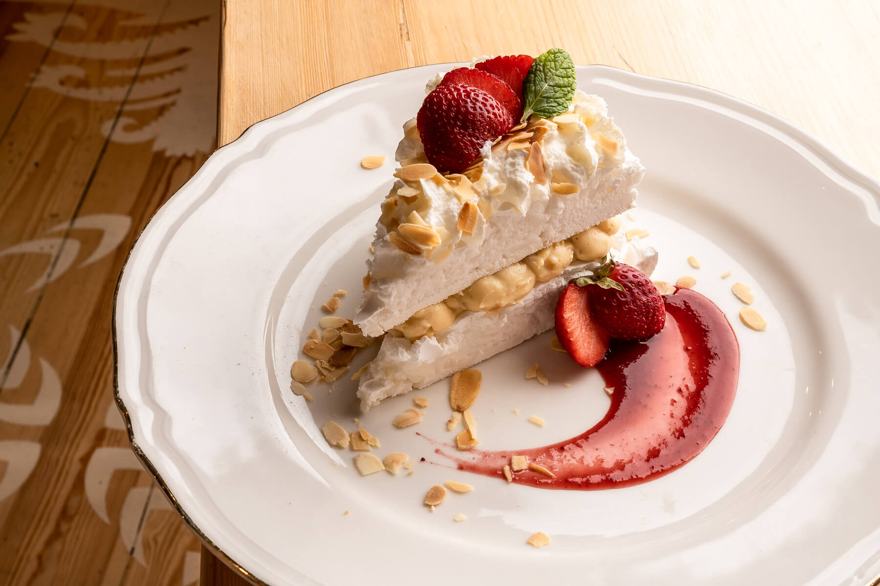 Połączenie słodkiej, lekkiej bezy z kremowym i puszystym kremem waniliowym i likierem Amaretto z truskawkami.