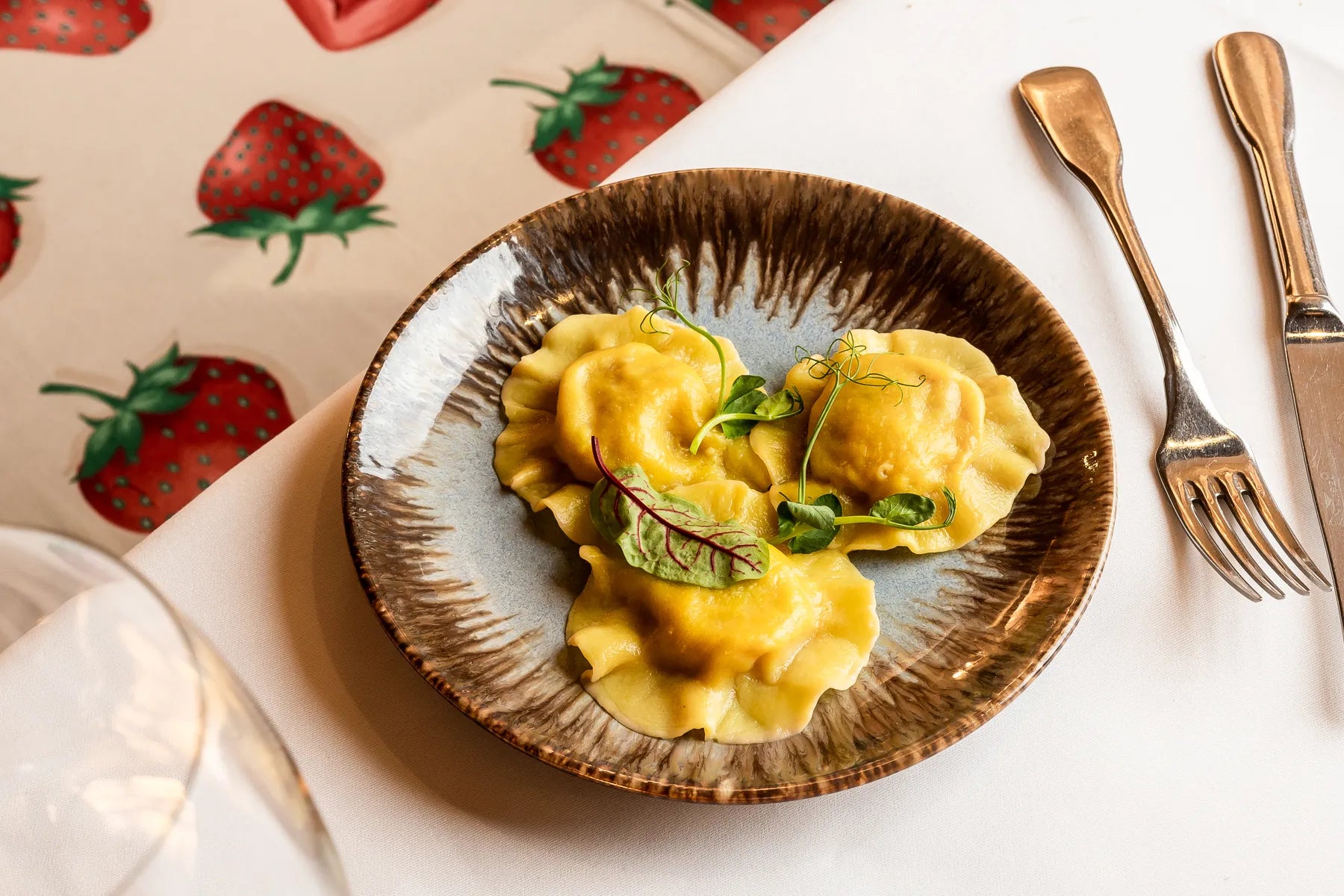 Pierogi faszerowane pieczonym batatem, rumianym czosnkiem z dodatkiem karmelizowanej cebuli. Farsz z batata nadaje daniu słodkawy posmak zaostrzony papryką chilli. Idealna propozycja dla wszystkich, którzy poszukują nowatorskich doznań kulinarnych.