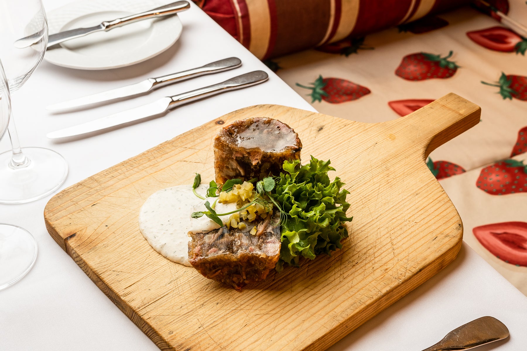 Tradycyjna galareta gotowana na golonkach i nogach wieprzowych, obficie doprawiona majerankiem i polskim czosnkiem. Podawana z ogórkami kiszonymi z Hajnówki i musem z prawdziwego tartego chrzanu. Danie bez dodatku konserwantów.