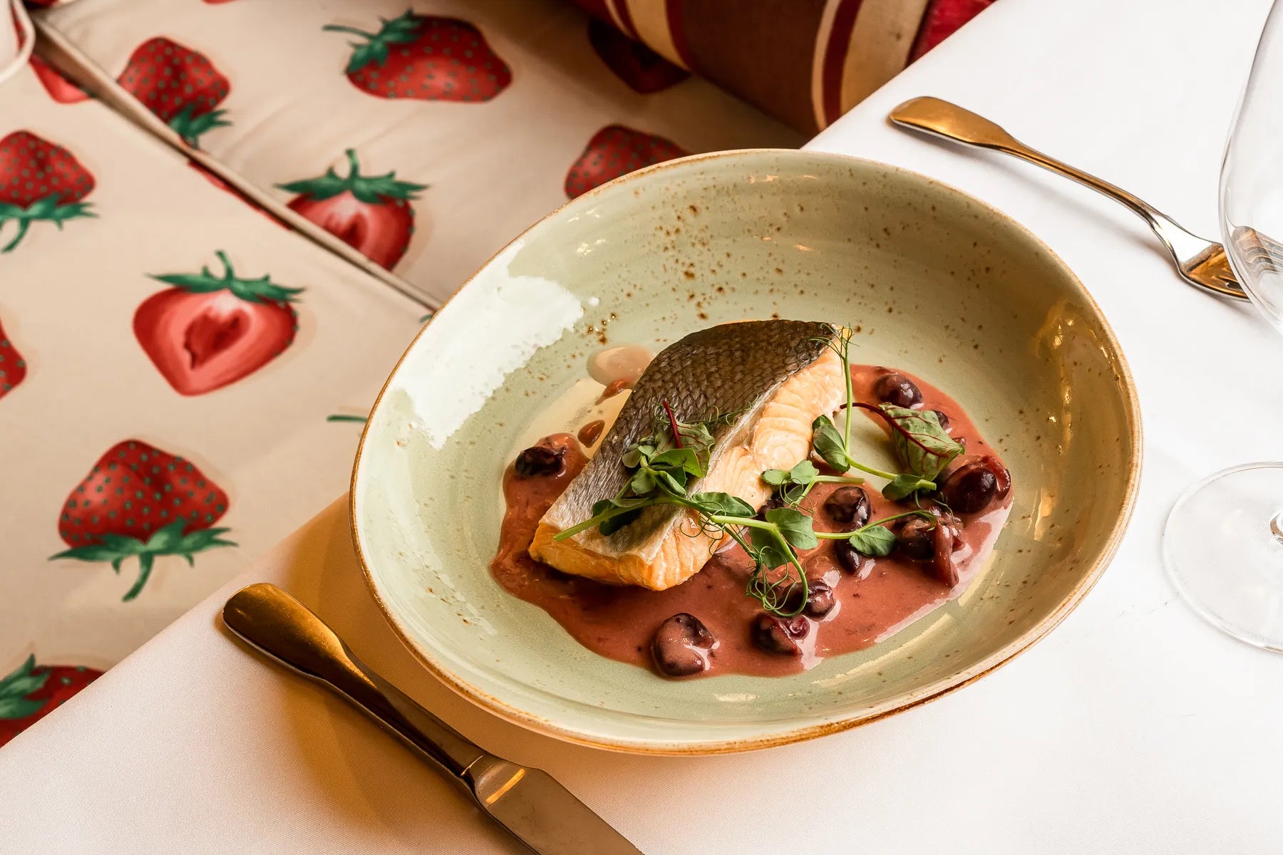 Filet z łososia z pieca podany na sosie z ekologicznej żurawiny z Hajnówki, wzbogacony korzeniem imbiru.