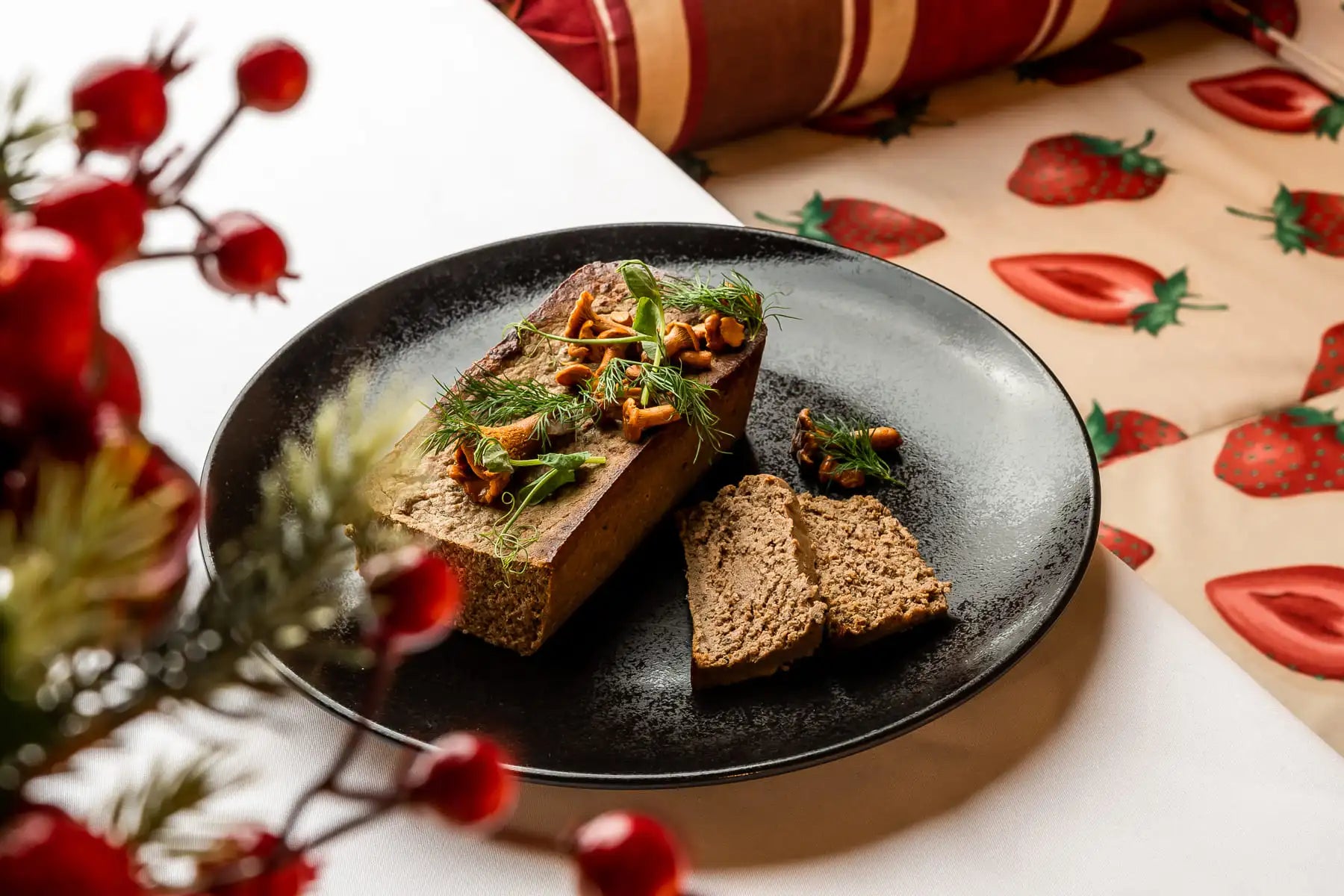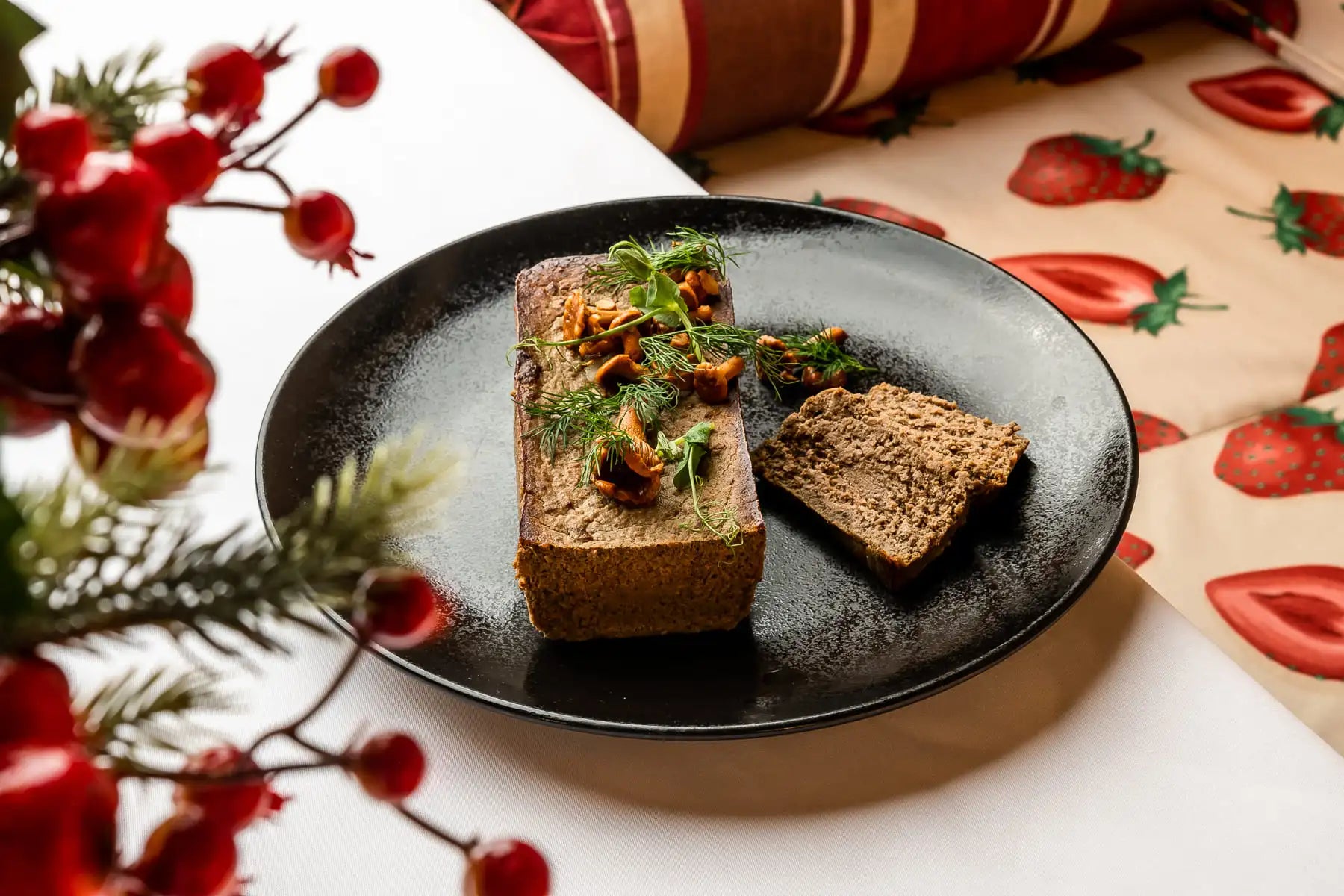 Aksamitny i puszysty pasztet z mięsa z sarny dzika i jelenia z dodatkiem dużej ilości suszonych prawdziwków aromatyzowany świeżo zmieloną gałką muszkatołową.