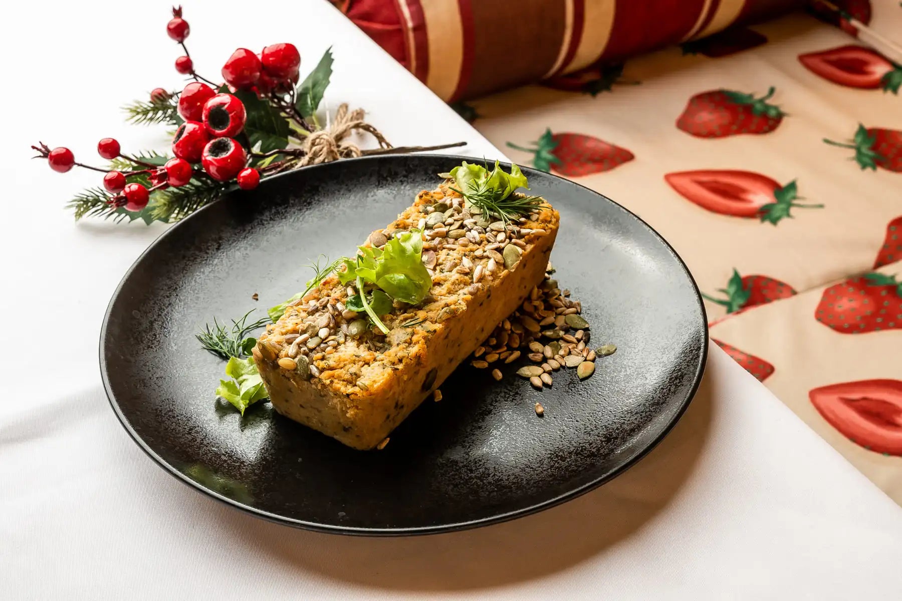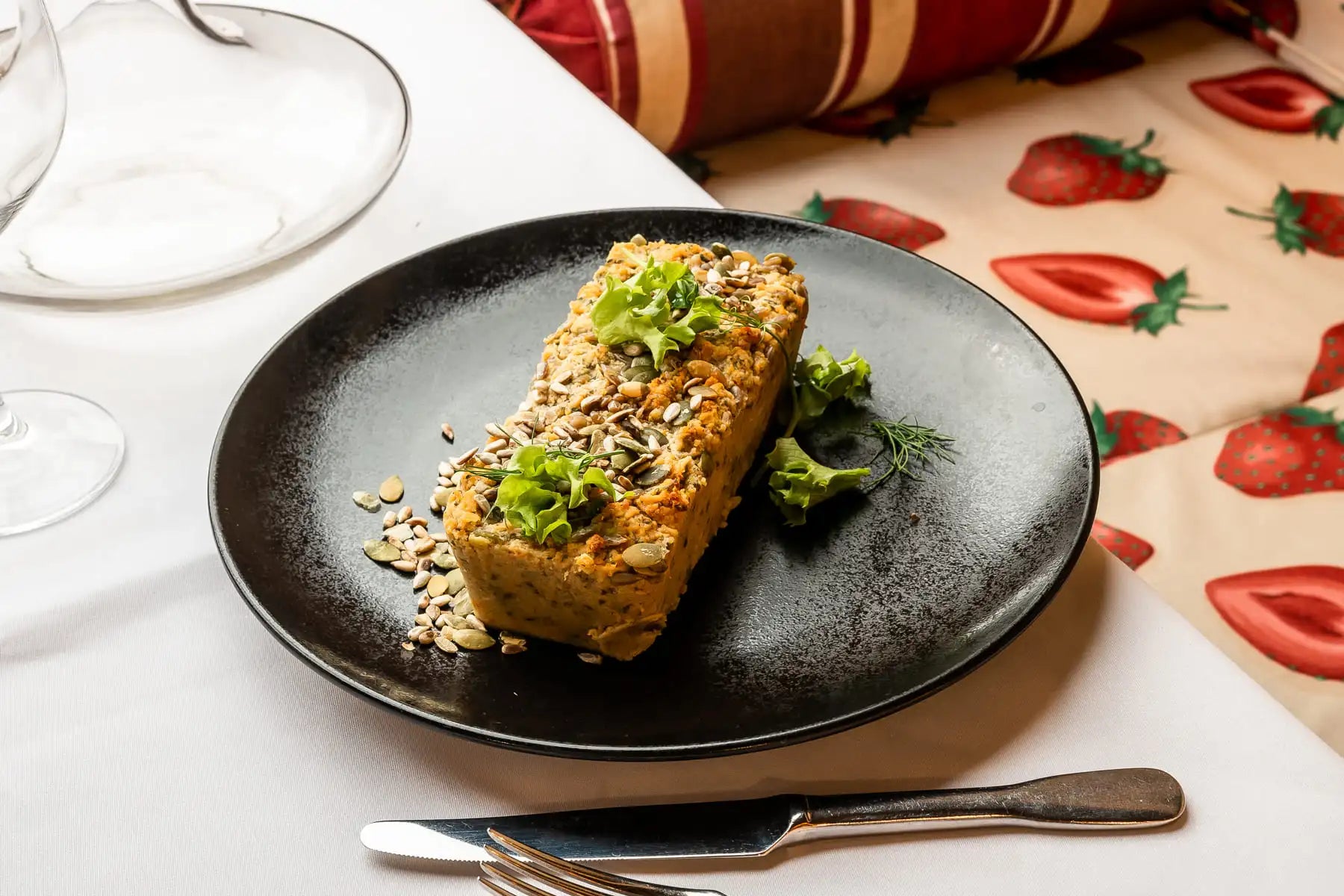 Wegetariański pasztet z czerwonej soczewicy z dodatkiem korzennych warzyw, płatków ziemniaczanych i wegańskiej śmietany.