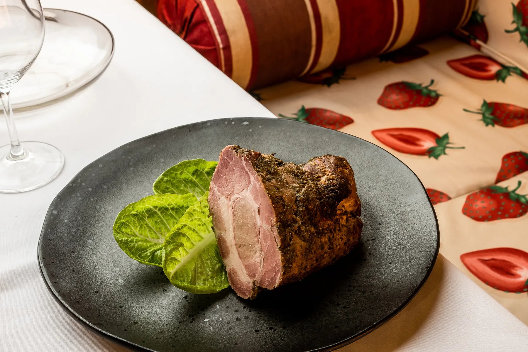 Marynata ze świeżych ziół nadaje potrawie intensywny aromat i wyjątkowy smak. Pieczeń z karkówki pieczona w niskiej temperaturze, charakteryzująca się niesamowitą soczystością. Idealna na świąteczny stół.