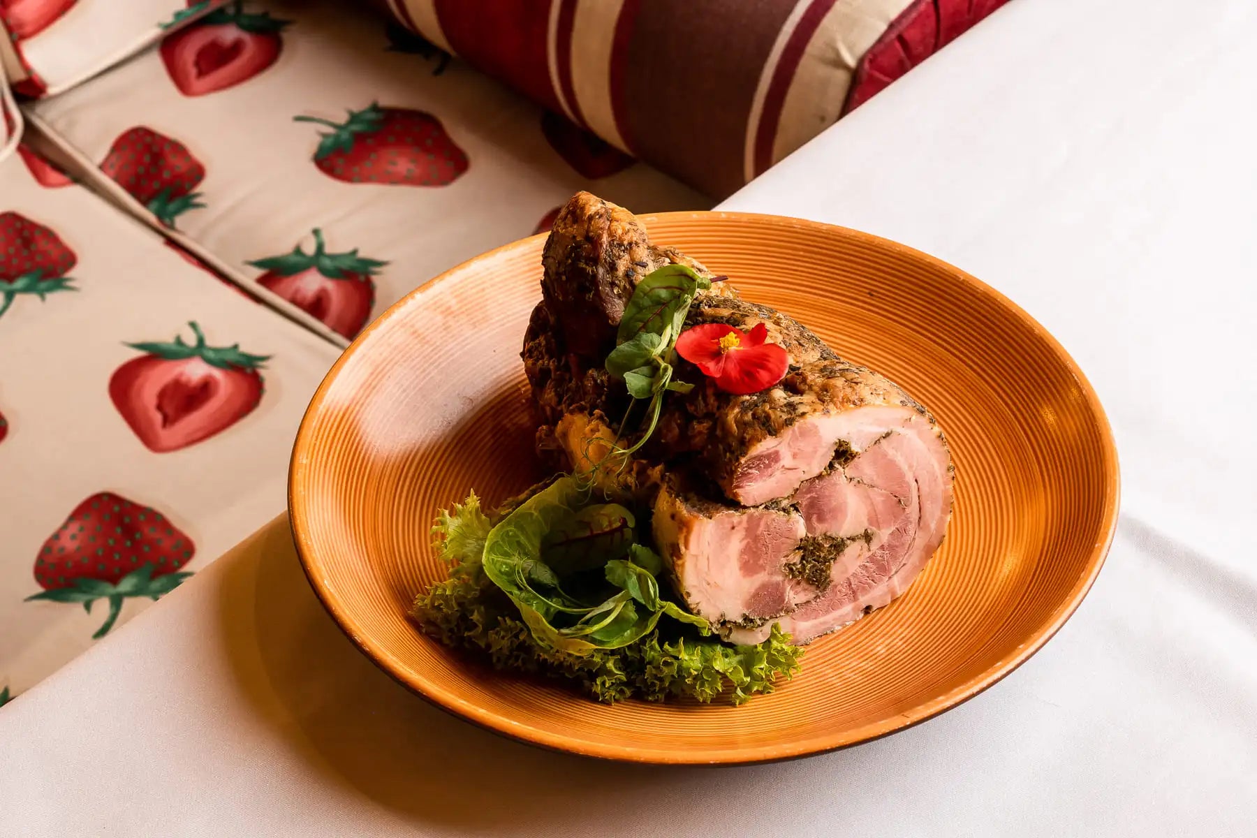 Pieczony boczek Magdy Gessler charakteryzujący się aromatycznym smakiem świeżych ziół.