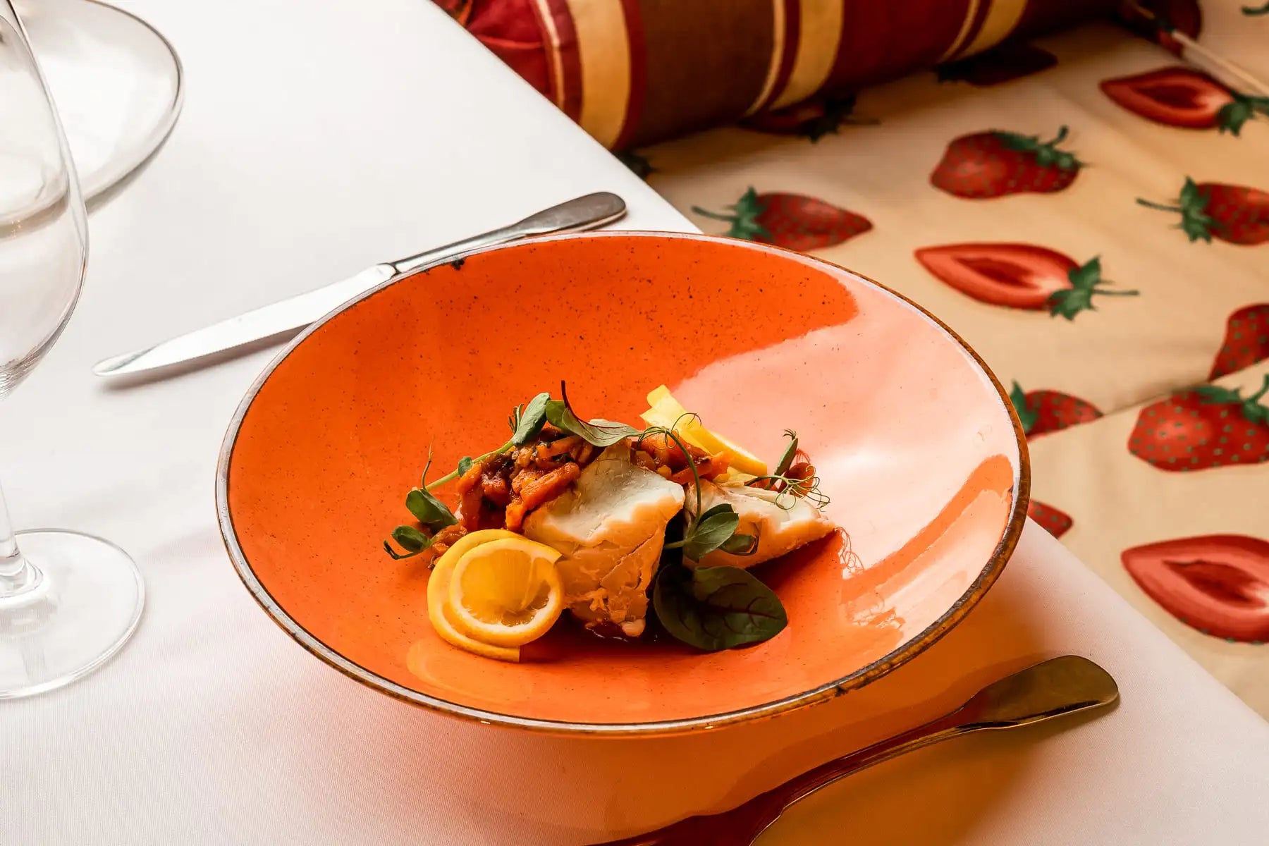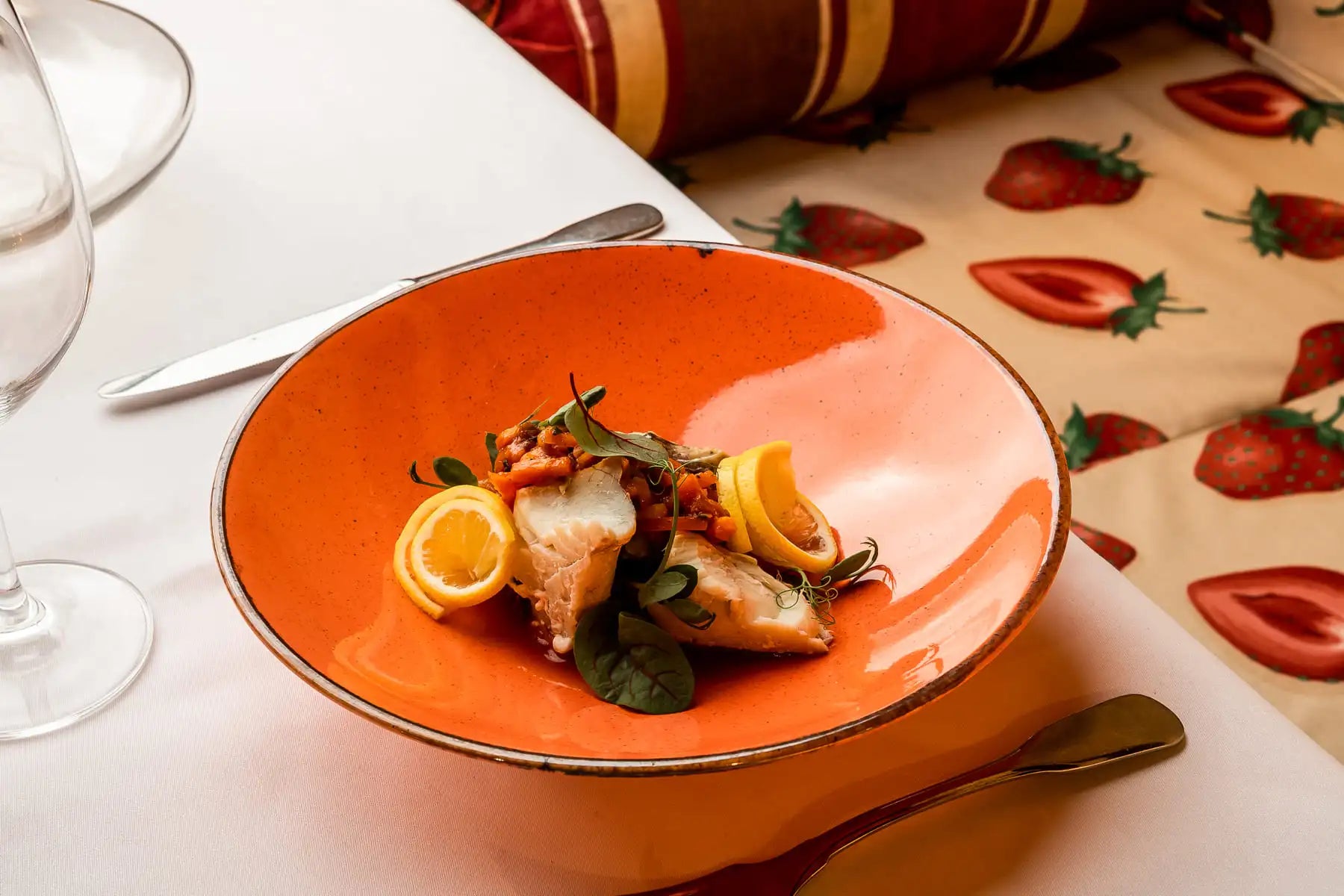 Polędwica z dorsza po grecku „inaczej” z pieczonym bakłażanem i papryką doprawiona kminem rzymskim, sokiem cytrynowym i kolendrą z dodatkiem soku z pomidorów malinowych. Potrawa ta doskonale łączy świeże smaki ryby z intensywnością warzyw oraz przypraw.