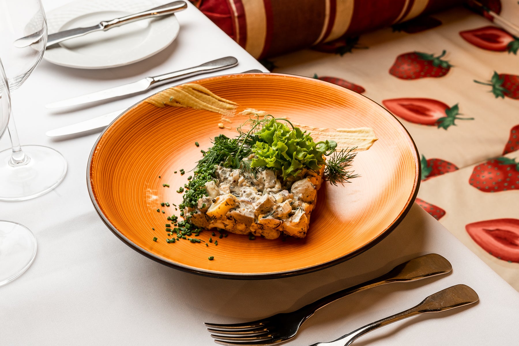Sałatka z gotowanych ziemniaków z dodatkiem suszonych prawdziwków, marynowanych grzybków, ogórka kiszonego, boczku i karmelizowanej cebulki z domowym aioli i musztardy francuskiej.