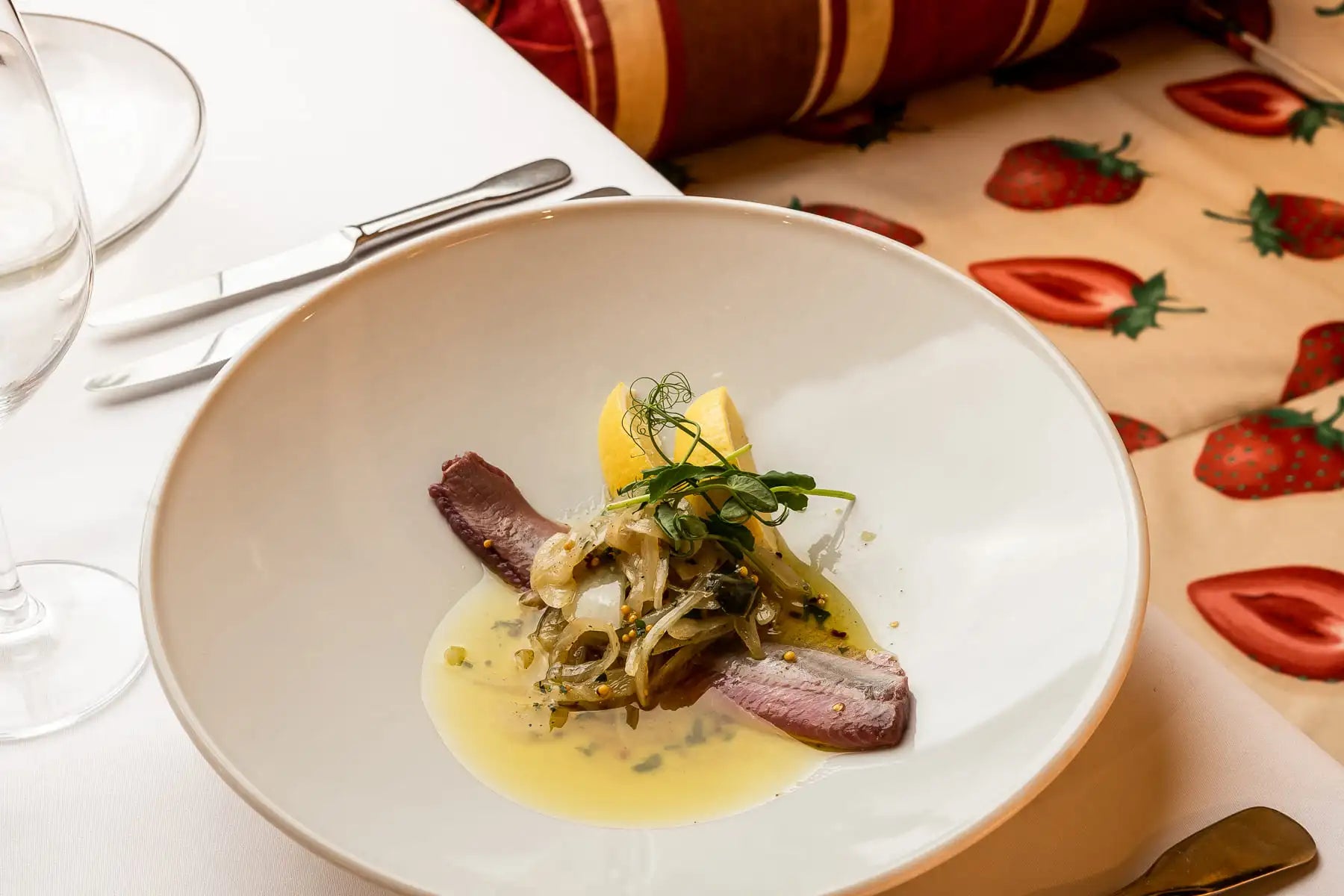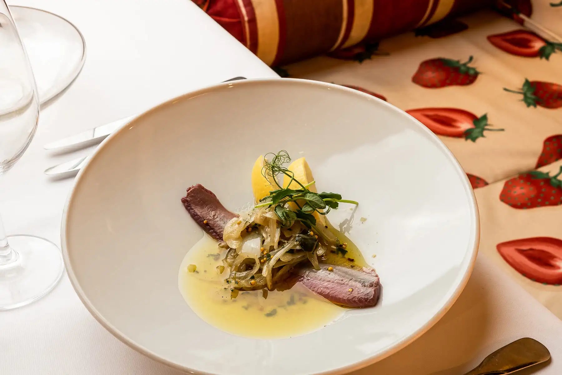 Filet ze śledzia w tradycyjnej zaprawie z cebulki wcześniej sparzonej, liścia laurowego, ziela angielskiego i oleju lnianego z zaprzyjaźnionej tłoczarni. Biała cebulka, ze swoim łagodnym smakiem, równoważy intensywność śledzia tworząc harmonijną całość smakową.