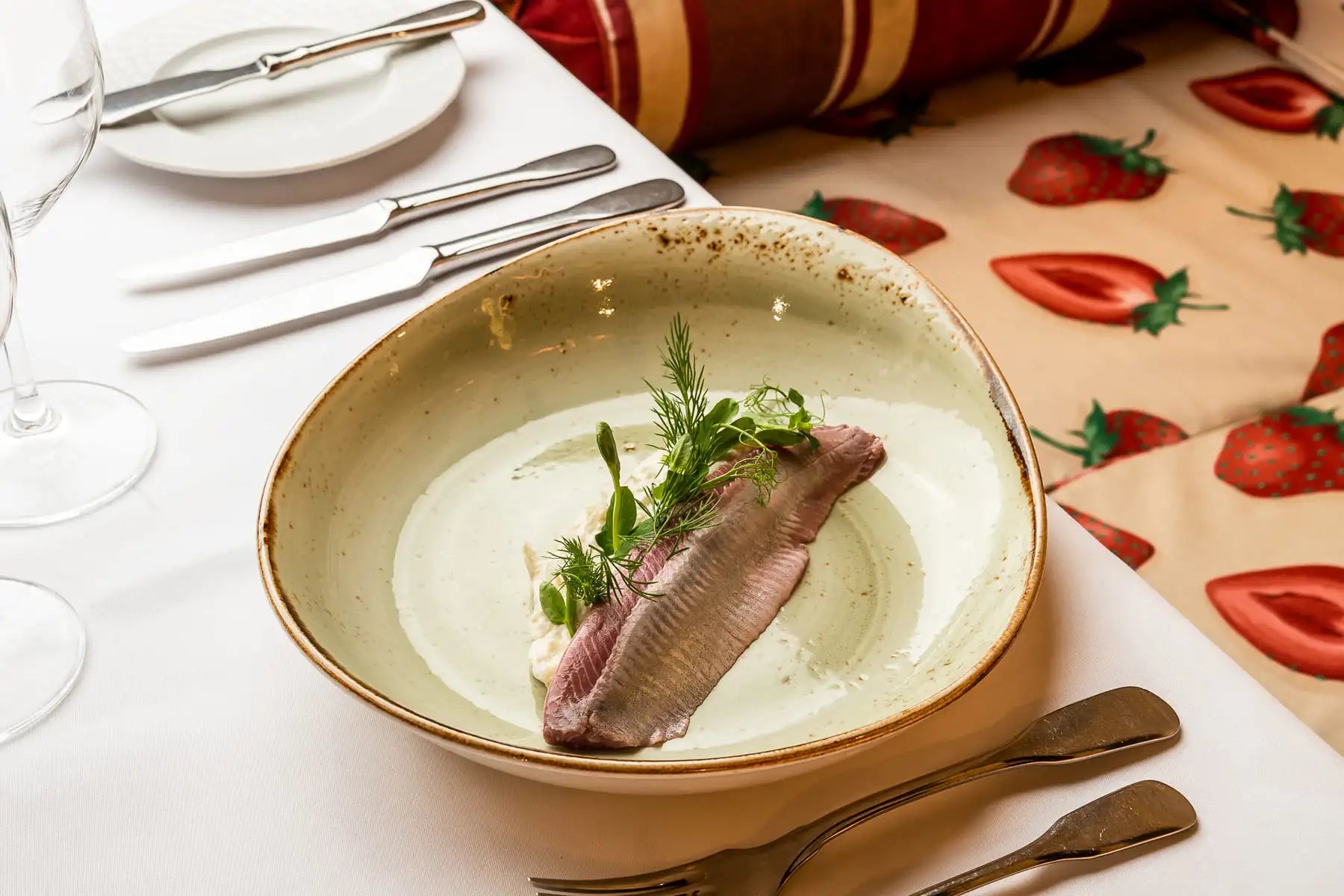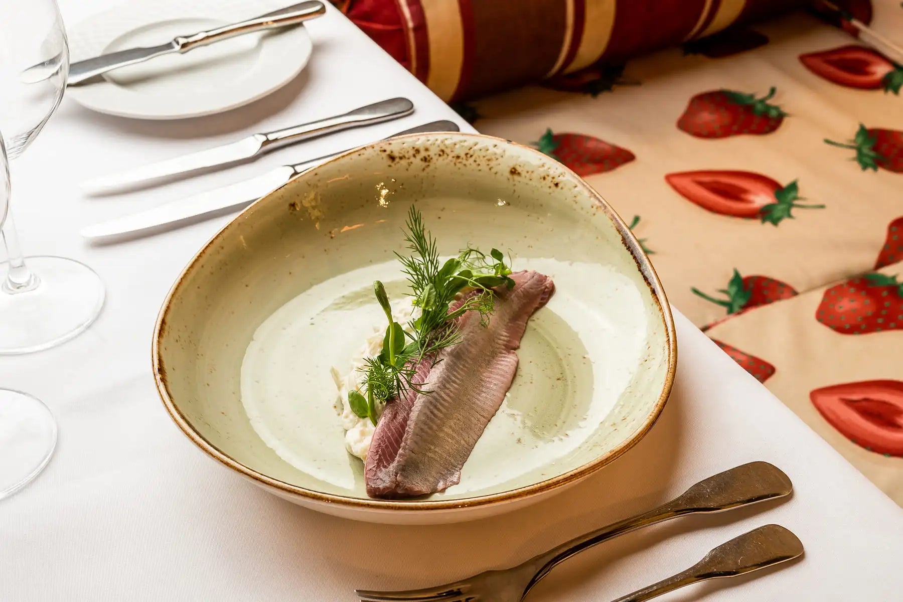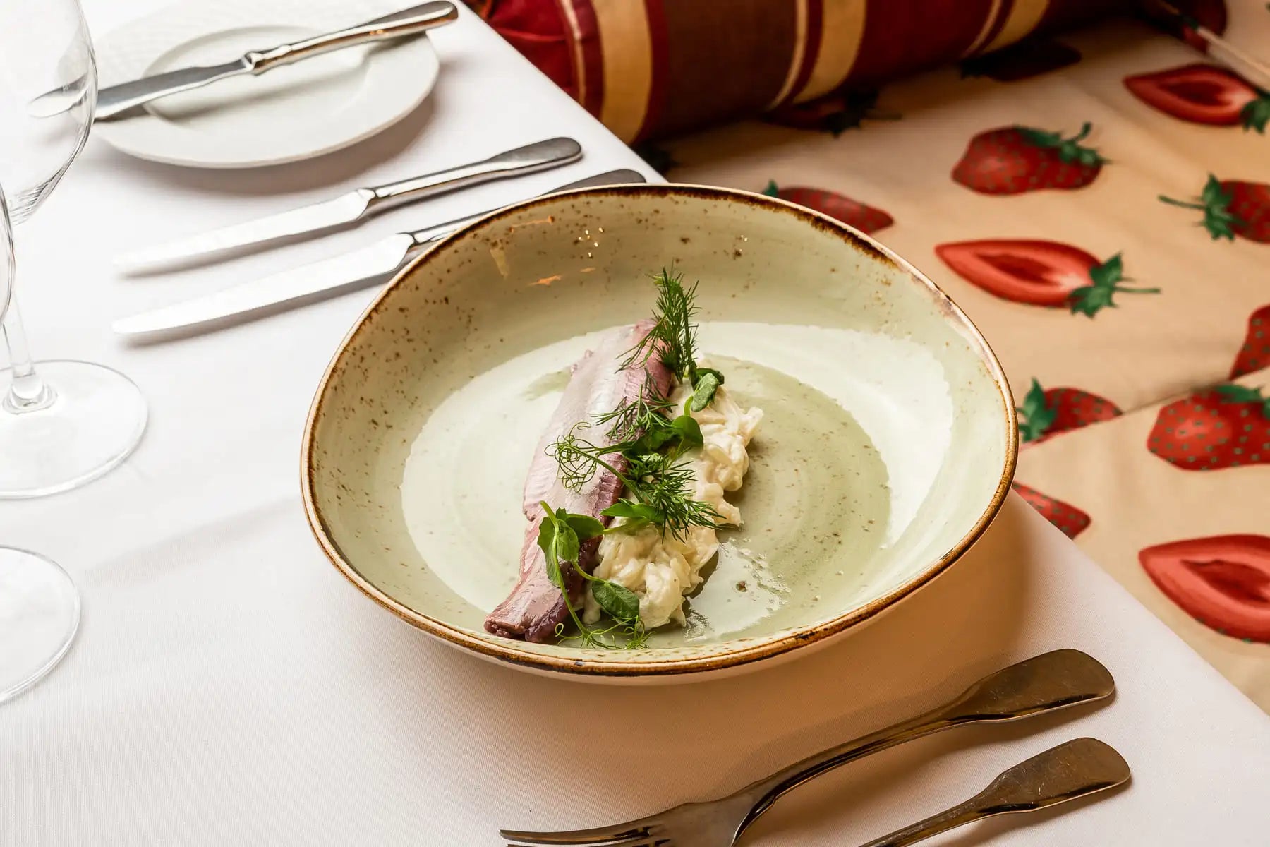 Filety śledziowe w zaprawie z kwaśnej śmietany - kwaszonej u nas. Podawane z dodatkiem antonówki, szalotki oraz świeżego kopru. Potrawa ta to tradycyjne i smaczne danie, które łączy w sobie intensywność śledzi z kremowym smakiem sosu śmietanowego.