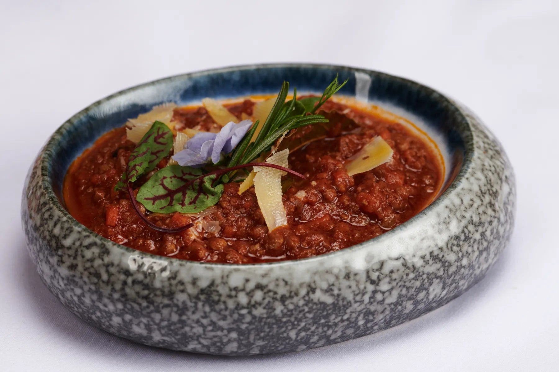 Prawdziwy włoski sos bolognese długo gotowany na udźcu wołowym z pomidorami malinowymi, słodką cebulą i czosnkiem, doprawiony świeżymi liśćmi bazylii.