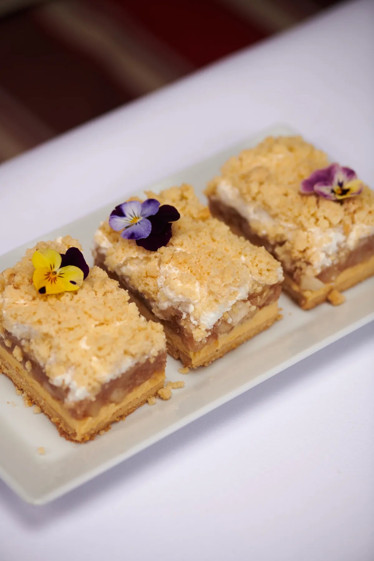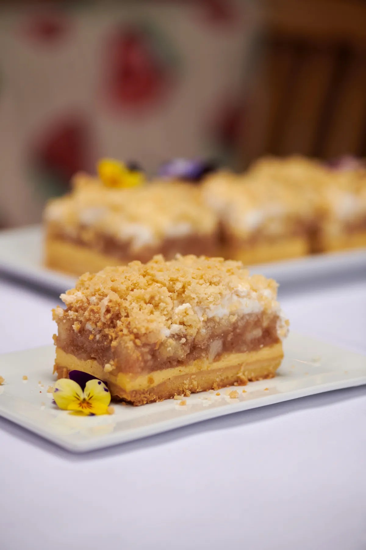 Szarlotka z kruszonką charakteryzuje się ciastem, które pokryte jest warstwą soczystych, duszonych jabłek. Całość zwieńczona kruchą kruszonką nadającą ciastu chrupkości i wyjątkowego smaku. Idealna propozycja dla miłośników klasycznych, domowych smaków.
