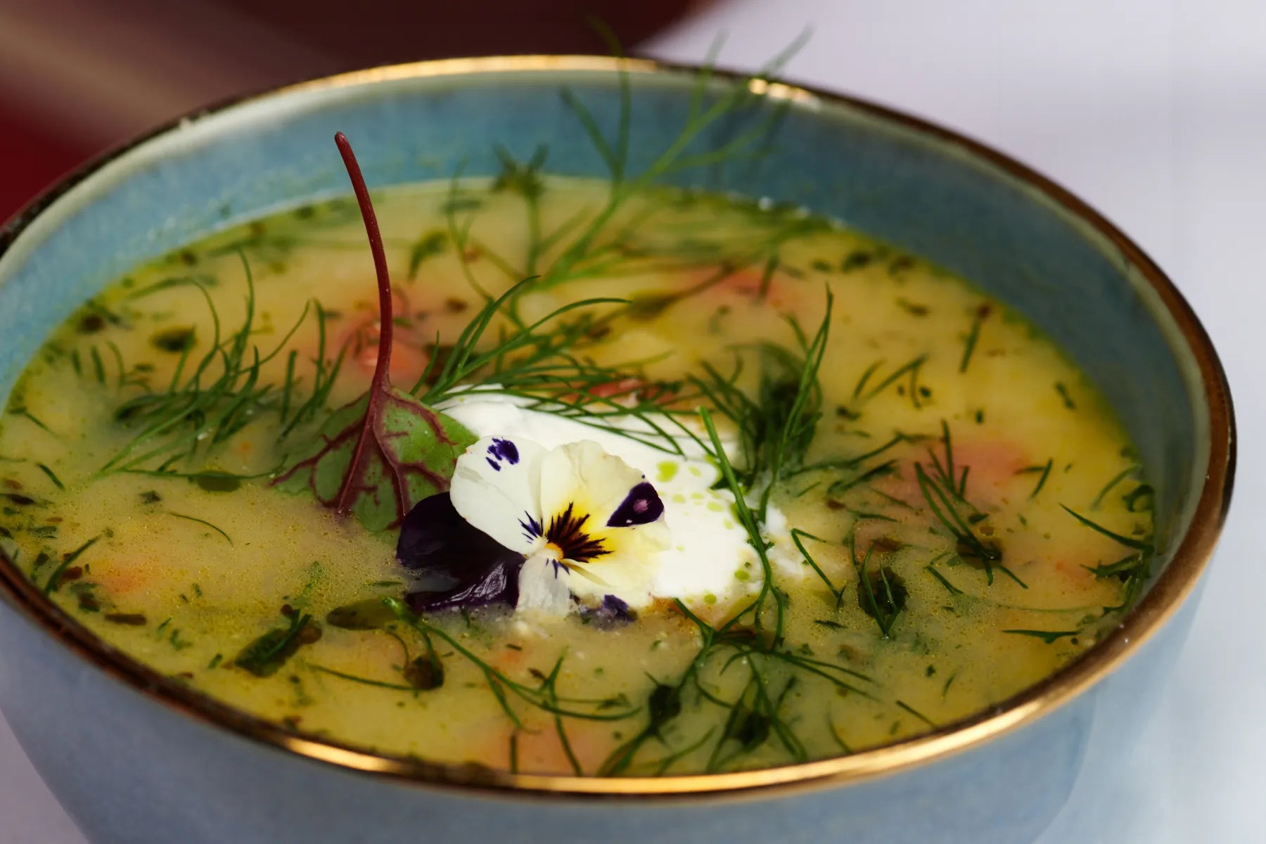 Gotowana na wywarze wołowo-kaczym z młodymi warzywami, doprawiona dużą ilością świeżego kopru, zabielana kwaśną wiejską śmietaną.